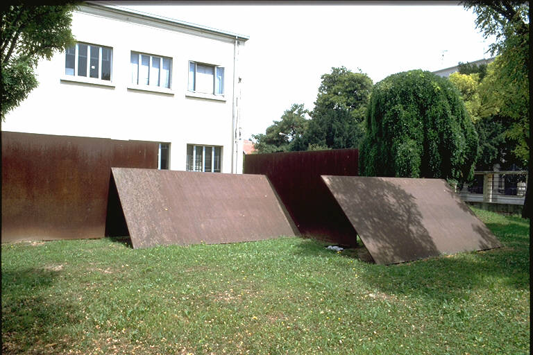 - NOTIZIE STORICO CRITICHE L'opera venne donata alla Galleria dopo essere stata presentata nei giardini del Palazzo Te, a Mantova, in occasione della festa dell'Unità 1987.\nSi tratta di una costruzione che si auto-scompone , riducendo ai minimi termini il volume, che diventa castello di lastre ferruginose, l'una appoggiata sull'altra in precario equilibrio. La corporeità si disgrega , al suo posto rimangono le ombre metalliche, icone della contraddizione tra costruzione e distruzione. La struttura modulare che si sviluppa in larghezza è stata pensata per riproporre lo sviluppo architettonico del Palazzo Te.\nL'artista è nato a Taranto nel 1932 e vive a Roma. Titolare della cattedra di Scultura all'Accademia di Belle Arti di Firenze. Espone dal 1952 con interessi nella pittura dal realismo all'informale. Prima mostra personale nel 958. Dal 1962 al 1967 fa parete del Gruppo I di Roma svolgendo ricerche plastico-costruttive. Dal 1969 realizzai Costruttivi Trasformabili, organismi modulari in ferro o acciaio e svolge interventi di Trasformazione nelle galleri d'arte e nello spazio urbano, proponendo una cultura progettuale , trasformabile nel tempo, di ordine ambientale e partecipativo. Dal 1978 realizza Ambienti-Scultura. Ha partecipato alla Biennale di Venezia in diverse occasioni, alla Biennale di PArigi , alle Biennali di San Paolo del Brasile e alle Quadriennali di Roma. Ha tenuto numerose personali in Italia e all'estero.