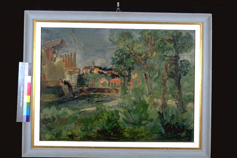 - NOTIZIE STORICO CRITICHE Al III° Premio Suzzara (1950) vinse L.15.000, una cassetta di liquori e 5 volumi Mondadori.\nIn quest'opera la definizione delle forme è affidata, più che al disegno, ad una pennellata rapida e corposa, che ricorda certa pittura di paesaggio tardo impressionista. Il tema del paesaggio industriale, presente in molta pittura del '900 e in particolare nel dopoguerra, è anch'esso di derivazione ottocentesca. In questo caso l'atista rappresenta il contrasto tra la natura e il mondo meccanico dell'industria, privandolo, però, di ogni connotazione drammatica.\nL'artista nasce a San Giovanni Bianco (Bergamo) nel 1915. Frequenta l'Accademia Carrara dal 1933 al 1938, per poi iscriversi all'Accedemia di Brera. Espone nel '38 al Premio di Pittura Sarfatti, a Milano ed ottiene il primo premio al concorso Nazionale per il Disegno di Brera (1939). A causa della guerra è costretto ad interrompere gli studi universitari. Nel periodo post-bellico pertecipa a diverse mostre sia a Bergamo che a Milano .E' tra i fondatori del Gruppo Bergamo. Nel 1957 tiene una personale alla Galleria Bergamo.Ottiene nel 1958 il I° Premio Dalmine. Dagli anni Sessanta insegna prima al Liceo Artistico di Bbergamo, poi all'Accademia di Belle Arto di Bologna, dove dal 1970 è titolare della cattedra di Pittura e Decorazione. In questo periodo espone in diverse città italiane, fra le quali Milano, Serravalle Scrivia, Napoli, Como, Verona, Roma, Perugia. Un imponente Cristo realizzato a mosaico decora l'abside della nuova di chiesa di Azzano San Paolo (Bergamo, 1970).