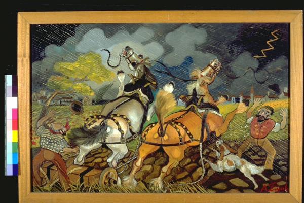Cavalli all'aratro. Due cavalli imbizzarriti, con accanto due uomini ed un cane, nel bel mezzo di un temporale