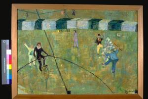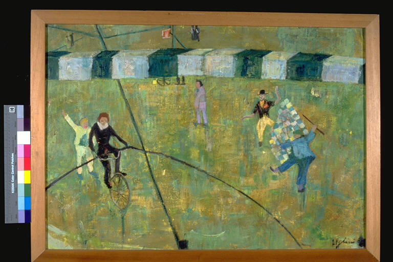 - NOTIZIE STORICO CRITICHE Al XI° Premio Suzzara (1958) vinse una cucina a gas e 4 volumi Einaudi.\nStile elementare, senza l'uso della prospettiva. Il campo visivo è interrotto da una trave zebrata piazzata a livello del punto di vista, che nasconde una fascia della scena degli artisiti da circo, che si intende quindi sottostante.\nL'artista nasce a Forl nel 1910 .Dopo il trasferimento della famiglia a Berna, in Svizzera, rientra quattordicenne a Forlì. Nel 1930 sposa un modellatore di fonderia, Giulio Zoli. Dall'inizio degli anni Cinquanta si dedica con assiduità alla pittura. Nel 1953 espone a Milano alla Galleria d'Arte Internazionale e a Cesenatico. Seguono mostre in altre città romagnole. Nel '56 esordisce nella città natale con un'esposizione presso il Circolo 'Renato Serra'.\nNel 1957 si iscrive all'Accademia di Belle Arti di Firenze. Segue i corsi di pittura all'Accademia di Belle Arti di Ravenna. Nel frattempo partecipa ai maggiori concorsi d'arte in ambito emiliano e realizza ornati e decorazioni in diversi edifici forlivesi. Nel '59, nel salone della Fondazione Garzanti di Forlì, si tiene un'esposizione di opere, graffiti, tempere, affreschi, ispirate alla Madonna del Fuoco. Nei primi anni '60 soggiorna in diversi paesi europei. Nel 1970 è in estremo Oriente. Nella primavera del '71 espone nella galleria parigina di Camille Renault. Seguono numerose mostre personali a Forlì ed in altre città romagnole. Nel 1979, durante un soggiorno a Sydney, esegue un graffito per la Scuola d'infanzia 'S. Francesco' di Leichardt, frequentata da bimbi italo-australiani.\nNel corso degli anni '80, svolge un'intensa attività come graffitista a Forlì ed in altre località romagnole e propone al pubblico nuovi cicli tematici. Nel 1981 tiene corsi di disegno presso l'Istituto Statale d'Arte. Facendo seguito ad altre precedenti donazioni, nel 1988 offre ai musei civici della sua città una serie di cinquanta opere grafiche.\nArtista versatile, dotata di straordinaria vitalità creativa, Irene Ugolini Zoli approda alla pittura come autodidatta, inizialmente attratta dalla lezione di Van Gogh e di Gauguin. Nel corso della sua quasi cinquantennale attività manifesta varietà e mutevolezza di stili e di motivi ispiratori, comunque riconducibili a modalità figurative, con la capacità di rompere la sfera del verisimile e di procedere oltre la soglia dell'immaginario.