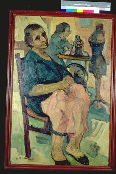 La sarta. Sarta seduta con abito da cucire in grembo Sullo sfondo, sarta alla macchina da cucire