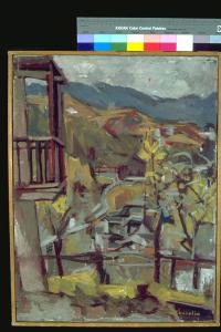 Paesaggio rurale. Rappresentazione di una vallata, con un balcone in primo piano Sfondo montuoso