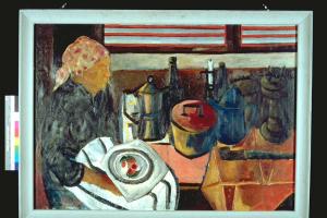 - NOTIZIE STORICO CRITICHE Al XIV° Premio Suzzara (1961) vinse L.30.000, una cucinetta a gas una ghiacciaia e una medaglia d'argento.\nOpera che risente delle suggestioni cezanniane, di studio dei volumi e della loro anticonvenzionale articolzione nello spazio. Gli oggetti presentano tutti un pesante contorno nero, al contrario del profilo femminile che, assieme al velo, è definito quasi con delicatezza, sebbene privo di evidenza fisiognomica.\nL'artista nasce a Casei Gerola (PV) nel 1932. Ha studiato all'Accademia di Brera con Aldo Carpi e Domenico Cantatore. Nel 1957 si rivela al Premio Diomira ed espone alla Galleria Spotorno. Inizia ad esporre con gli altri giovani pittori di Brera ("Terza Generazione"). Nel 1960 tiene una personale alla Galleria Il Torcoliere di Roma ed una ad Alessandria. Nel 1961 vince il Premio del Comune alla Triennale di Milsno e negli anni successivi ottiene altri prestigiosi riconoscimenti. Nel 1966 è invitato ad esporre al Palazzo del Turismo di Riccione ed è presente con tre opere alla mostra dell'EIDAC al Palazzo Reale di Milano. Conosce il meastro Ernesto Treccani ed espone nel 1971 con Piero Leddi una selezione di opere alla "Fondazione Corrente". Inizia negli anni Settanta una serie di fruttuosi viaggi-studio a Parigi, Vienna, Amstersam, Stoccolma, Copenhagen,Oslo, che gli consentono la conoscenza diretta di Permeke, Munch, Kokoschka, Nolde e Picasso. Nel 1972, all'apice della speculazione concettuale del "Realismo critico", espone con Gasparini, Guttuso, Leddi, Mainoldi e Dimitri Plescan in numerose gallerie e spazi pubblici. Aggiornato sulle ricerche linguistiche d'avanguardia, in un dialogo fittissimo con i maestri dada e principalmente Marcel Duchamp e gli americani, elabora negli anni Novanta un linguaggio personalissimo focalizzando l'interesse sullo specifico della comunicazione di massa (performances nello Spazioviola di Torrazza coste con Leddi, Guarnone, Malinverni, Treccani, Valsecchi e altri; installazioni alle Fiere Internazionali di Padova e Vicenza).