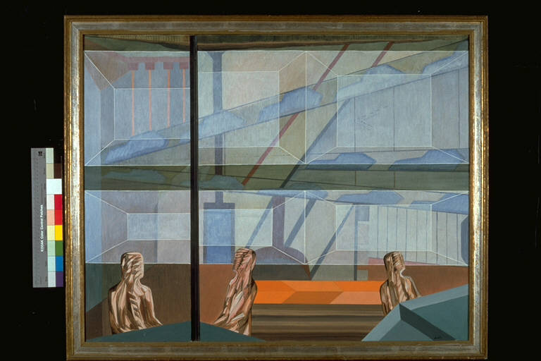 - NOTIZIE STORICO CRITICHE Al XXI° Premio Suzzara (1968) vinse il vitello.\nOpera che, con suggestioni neometafisiche nella composizione, si inserisce nella corrente di opposizione al prammatismo delle società tecnologiche e spersonalizzanti: gli impiegati sono infatti delineati come manichini senza identità, e l'ambiente circostante è costituito da vari livelli di "realtà programmata", elementi tipici del panorama industriale e burocratico dell'epoca. \nL'artista nasce a Savona nel 1927. Pittore, scultore e ceramista. Le prime esperienzee materiche ed informali le compie ad Albissola Mare. Dal 1955 si stabilisce a Milano. Nel 1957 partecipa alla mostra "Arte Nucleare" alla Galleria San Fedele. Negli anni Sessanta torna alla figurazione su vari aspetti della società conemporanea: le tecnologia, il rapporto uomo-macchina, l'alienazione, il consumismo. Dal 1967 comincia anche ad eseguire sculture in marmo e in bronzo. Negli anni Settanta perviene ad un linguaggio figurativo che risente della pittura metafisica e cubista. Negli anni Ottanta ha prodotto una serie di paesaggi di città americane in cui predomina il tema dello smog, affiancata alla serie degli "alberi". Nel 1990 realizza la scultura "L'Albero della speranza" all'ingresso della sede CEE a Bruxelles.