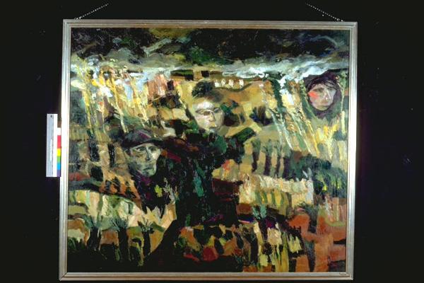 - NOTIZIE STORICO CRITICHE L'opera vinse il maiale e due forme di formaggio ex aequo con l'opera di Giuseppe Landini al Premio Suzzara 1967. Stile espressionista, con paesaggio reso secondo modalità informali e teste che emergono con un senso di inquietudine.\nUgo Maffi è nato a Lodi nel 1939. Pittore, incisore e ceramografo. E' stato allievo di Kokoschka, quindi ha seguito corsi di litografia e ha frequentato l'Accdemia delle Belle Arti. I suoi cicli pittorici comprendono gli interni contadini, le vaste distese della campagna lodigiana punteggiata di gelsi, le alluvioni dell'Adda, i Re, le mummie, il fiume, le ombre. Negli ultimi tempi utilizza materiali eterogenei quali stoffe, carte, cemento, sabbia, collages di foto assorbite nella pittura, associati però all'oro, come ad impreziosire la materia.