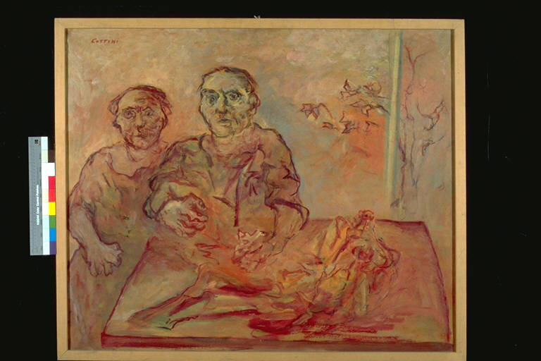 - NOTIZIE STORICO CRITICHE Al XXII° Premio Suzzara (1969) vinse il premio acquisto.\nOpera che si carica di un senso drammatico, sia a causa della tonalità genrale del dipinto, un rosso che degrada in infinite variazioni sanguigne, sia per l'espressionismo evidente soprattutto nei volti dei contadini, dai forti contorni, ma anche nelle loro figure, rese con segno contorto e tremulo, che non abbandona mai il colore rossastro.\nL'artista è nato a Brescia nel 1932. Ha compiuto studi artistici a Bergamo e a Milano. Dopo gli studi si è trasferito a Milano, dove ha insegnato Figura Disegnata al Liceo Artistico di Brera per 25 anni. Dagli inizi degli anni Sessanta ha esposto in numerosissime personali e collettive. Nella sua pittura, sono evocate immagini sepolte dal tempo, situazioni che hanno il sapore delle cose perdute, ma anche momenti violenti e tragici, in una serie di suggerimenti linguistici dai pittori di corrente al neoespressionismo di Bacon.