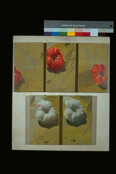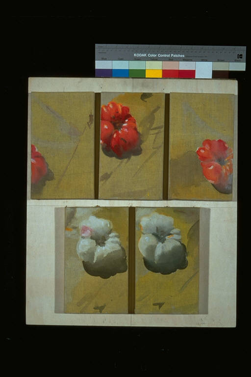 Piccolo orrido. Su ciascuna delle cinque tele è dipinto un fiore, ora intero, ora frammentario