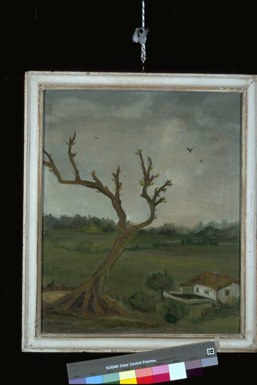L'albero fulminato. Paesaggio rurale con scheletro di un albero e fattoria