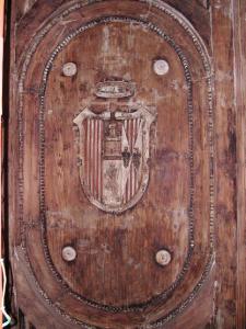 Nel cassettone centrale in scolpito in forma ovale è intagliato uno stemma, negli altri cassettoni di forma quadrata sono dipinti motivi floreali con foglie.