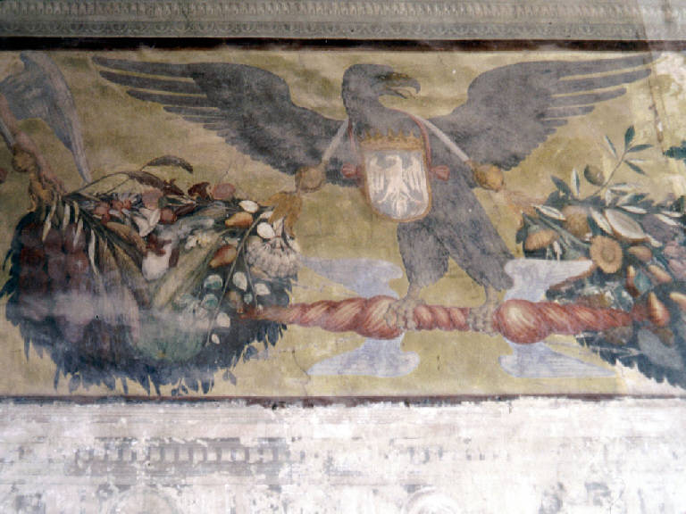 Fregio dipinto raffigurante aquile che portano al collo gli stemmi dei Gonzaga, Colonna, Aragona e con gli artigli sui dardi alati di Giove tra festoni di fiori e frutta.