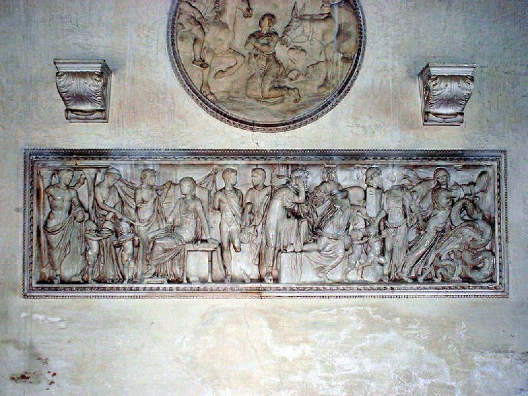 Sulla parete ovest ed est si trovano i pannelli raffiguranti la Storia di Medea e l'Ammazzonomachia, copie di sarcofaghi conservati al museo. Gli altri, dodici tondi di piccole dimensioni, sei quadrati, altri quadrangolari e circolari, replicano stucchi cinquecenteschi presenti in altre sale.