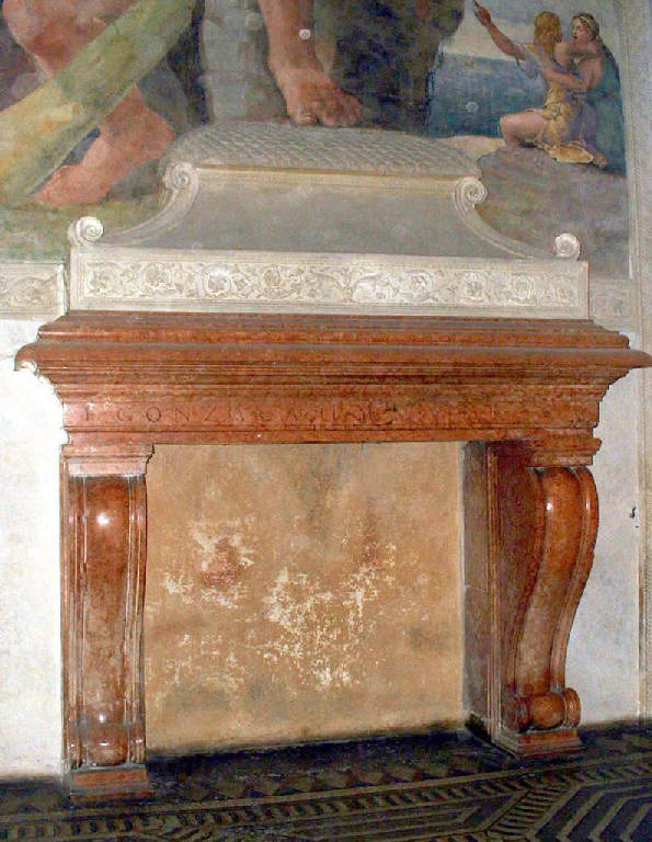 - NOTIZIE STORICO CRITICHE Il camino è ritratto nel "Taccuino" di Marten van Heemskerck. (Belluzzi A., Palazzo Te a Mantova,1998, p.390)\nL'iscrizione ricorda che il marchese Federico II Gonzaga è capitano generale delle truppe papali.
