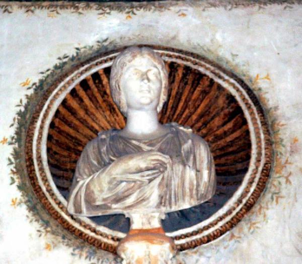 - NOTIZIE STORICO CRITICHE Jacolo Strada definisce i busti come "tre teste di marmo antiche"; Alda Levi (1931) le considera imitazioni romane fatte nel rinascimento; Paul Zanker (1983) invece come antiche. Secondo la restauratrice M.C.Ceriotti il marmo reca i segni della permanenza sotto terra e di una successiva rilavorazione (rifacimento degli occhi, del naso e ritocchi al panneggio). La critica (Fittschen) identifica la donna con Manlia Scantilla, moglie di Didio Giuliano, imperatore nel 193, oppure sua figlia Didia Clara. (Belluzzi A., Palazzo Te a Mantova,1998, p.408)