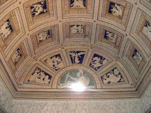 La volta a botte è scavata da profondi lacunari quadrati. Cornici a stucco dorate inquadrano i bassorilievi che spiccano sulle superfici colorate del fondo. Il pannello centrale è dedicato alla Parche, altri raffigurano divinità olimpiche e scene religiose.