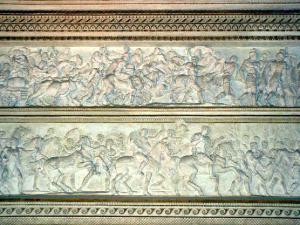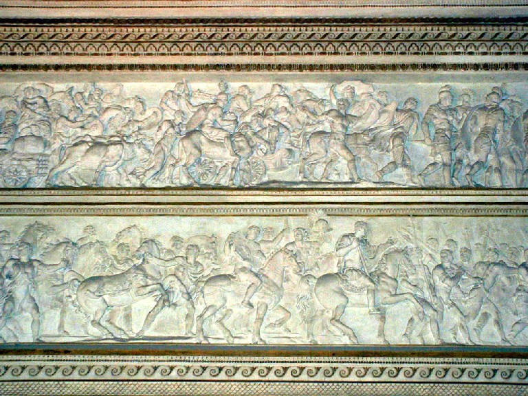 Lungo le pareti scorrono due fregi sovrapposti. Sui lati corti nelle lunette sono raffigurati ad est Ercole seduto sulla pelle di leone, appoggiato alla clava e coronato d'alloro; ad ovest Marte seduto con la spada, lo scudo e l'elmo.