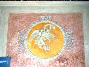 Il fregio cinquecentesco si sviluppa nella parte alta delle pareti: trofei di armi con figure di barbari prigionieri, candelabri scandiscono la composizione. In ogni lato un rilievo di forma rettangolare è affiancato da tondi con figure in stucco. La pittura incornicia i riquadri con foglie e fiori stilizzati ; nel campo bianco si snodano viticci a grottesche. Accanto alle scene principali altre scenette dipinte su campiture verdi e rosso cupo ornate di stucchi. Sulle pareti, sopra lo zoccolo dipinto ad imitazione del marmo, si dispongono riquadri delimitati da cornici stilizzate in cui le campiture a tinte pastello si alternano a fasce bianche. Modanature inquadrano sempli candelabre, corone e specchiature entro le quali sono dipinti personaggi mitologici come Venere, Marte e Ganimede.