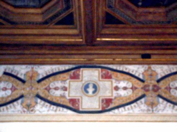 Il fregio si sviluppa nella parte alta delle pareti ed è dominato dalle grandi figure della Vittoria e della Fama collocate negli angoli. Sono in stucco anche i piccoli busti incastonati nelle croci ornamentali che scandiscono le pareti. Accanto agli ornati a rilievo le grottesche sono risolte con esili tralci e piccoli fiori su fondo bianco, giallo e rosso cupo; all'estremità delle pareti compaiono maschere su fondo nero.