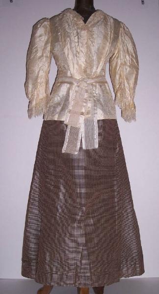 Completo femminile composto da gonna in seta a quadretti color écru e marrone e casacca in seta color avorio.