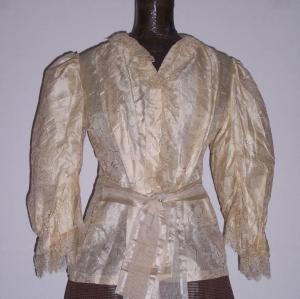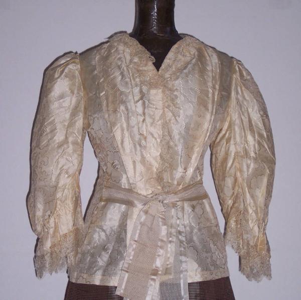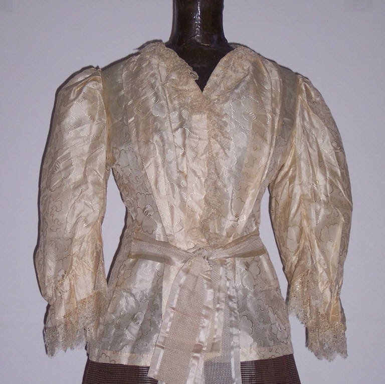 Casacca in seta color avorio con motivi floreali tono su tono; manica lunga con spalla a sbuffo; grosse pieghe nella parte anteriore; pizzo applicato ai polsini e all'allacciatura anteriore. Fusciacca applicata in vita; arricciatura nella parte posteriore.
