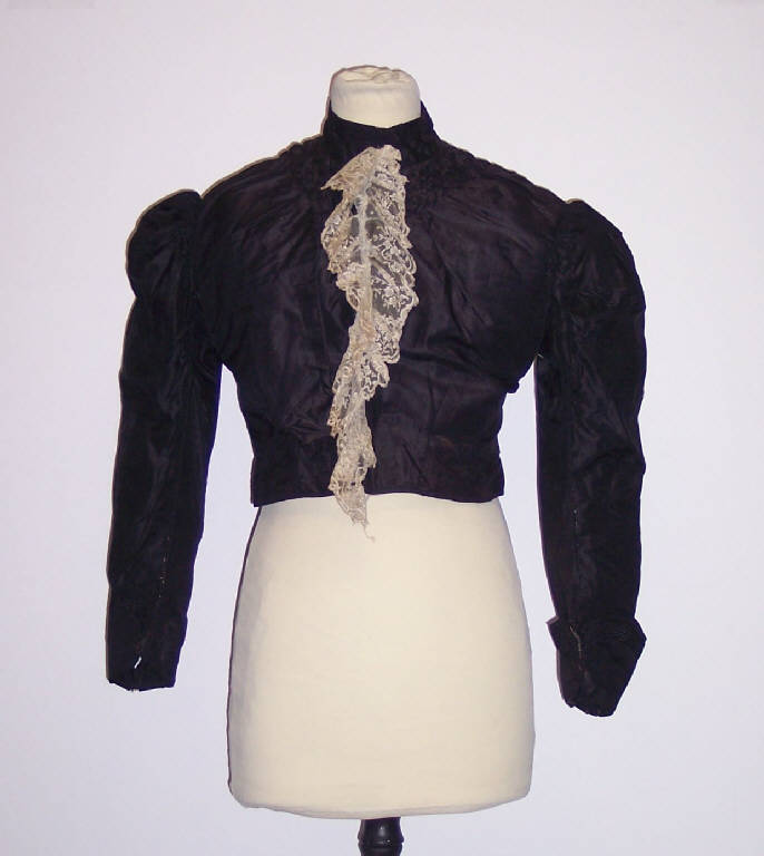 Corpetto in raso di seta nero; tulle bianco ricamato con motivi floreali applicato nella parte anteriore; allacciatura anteriore con gancetti metallici; colletto alla coreana; manica a sbuffo; fodera in cotone grigio.