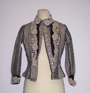 Giacchina in tela di cotone a quadretti bianchi e neri con inserti di pizzo bianco e seta nera. Colletto e polsini in pizzo e seta; arricciatura nella parte posteriore; allacciatura anteriore con bottoncini.
