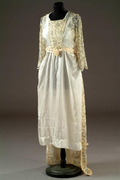 Abito composto da sottoveste, corpino e mantello in seta e filet ricamato.