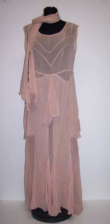 Abito senza maniche in chiffon di seta color pesco; profonda scollatura posteriore; balza applicata al giro vita e al fondo gonna; sciarpa decorata con perline.
