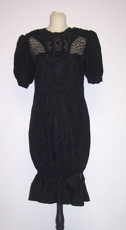 Abito in moiré di seta nero, stretto sul fondo da un elastico; maniche corte a palloncino; corpetto in tulle ricamato e decorazioni applicate; cerniera sul fianco sinistro; allacciatura posteriore con bottoncini automatici; spalline imbottite; fiocco fermato con paillettes d'oro applicato all'elastico del fondo gonna.