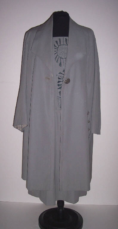 Completo femminile composto da abito e soprabito in seta pesante grigia.