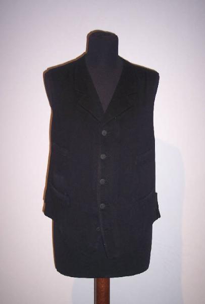 Gilet, parte del completo, in panno di lana nero nella parte anteriore e raso di seta nero nella parte posteriore; foderato in raso di seta bianco; quattro taschine nella parte anteriore; cinturina posteriore per regolare la larghezza.
