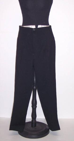 Pantaloni, parte del completo, in panno di lana nero; fodera in raso di seta bianco nella zona delle tasche; cinturina posteriore; bande laterali nere applicate. Sui bottoni è impresso il nome "Longini Brescia".