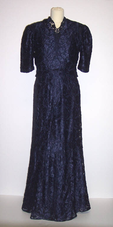 Abito lungo in raso di seta blu rivestito di pizzo blu con motivi floreali; manica corta; allacciatura posteriore con fiocco; bolerino in pizzo con gli stessi motivi foreali.