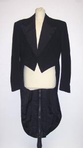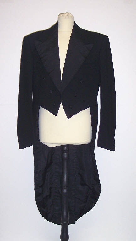 Giacca, parte del completo, in panno di lana nero foderata con seta nera; corta a punta nella parte anteriore e lunga nella parte posteriore.