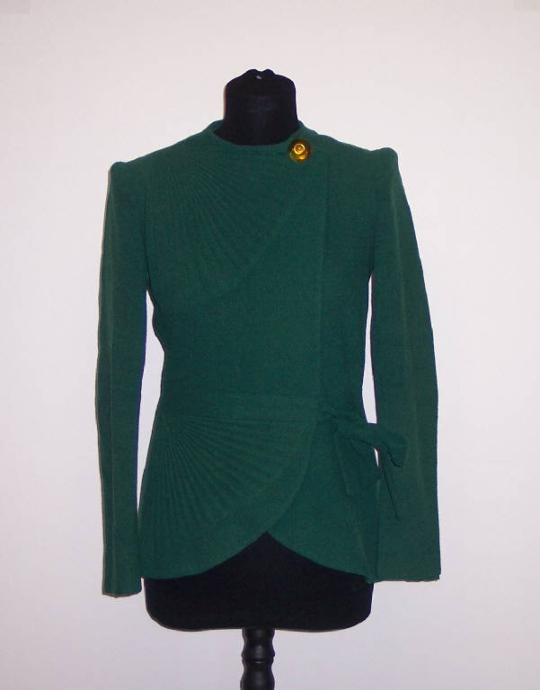 Giacca, parte del completo, in lana verde foderata in seta verde; allacciatura incrociata nella parte anteriore con nastro; bottone in plastica giallo.