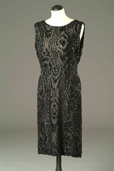 Abito senza maniche in raso di seta bianco rivestito da tulle nero; perline e paillettes nere applicate; scollatura rotonda; allacciatura posteriore con cerniera.
