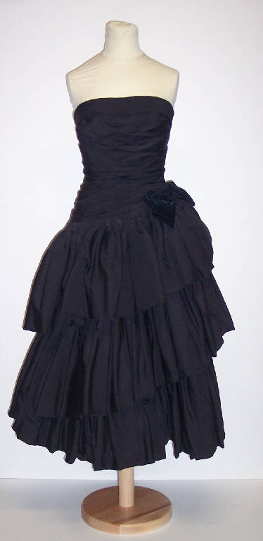 Abito in raso pesante nero; corpino attillato e arricciato, senza spallini, sostenuto da stecche interne; allacciatura posteriore con cerniera; gonna ampia a balze sostenuta da rigido tessuto sintetico nero; fiocco di velluto nero applicato in vita nella parte anteriore.