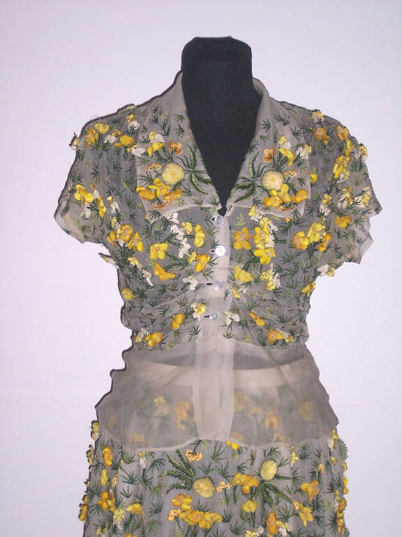 Casacca, parte del completo, in organza di seta color écru ricamata ad ago con applicazioni di fiori a rilievo di color giallo su tutta la superficie; maniche corte; allacciatura anteriore con bottoni; fodera in organza color écru.