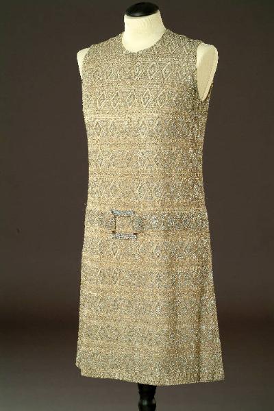Abito scamiciato in lamé operato oro e argento; grossa fibbia quadrata arricchita da strass, applicata al centro del girovita; allacciatura posteriore con cerniera.