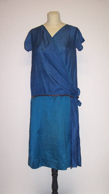 Abito in seta e raso di seta blu elettrico; maniche corte; scollatura a kimono; allacciatura con cerniera sul lato sinistro; cinturina di corallini; plissettatura sul fianco sinistro.