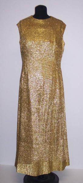 Abito scamiciato lungo in lamé dorato; fodera color oro; allacciatura posteriore con cerniera.