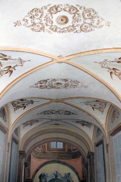 Volta affrescata a crociere intrecciate, si sviluppa su quattro campate. Decori monocromi caratterizzati da rameggi e rosoni negli elementi decorativi centrali e negli spicchi, da cetre stilizzate affiancate da aquile.