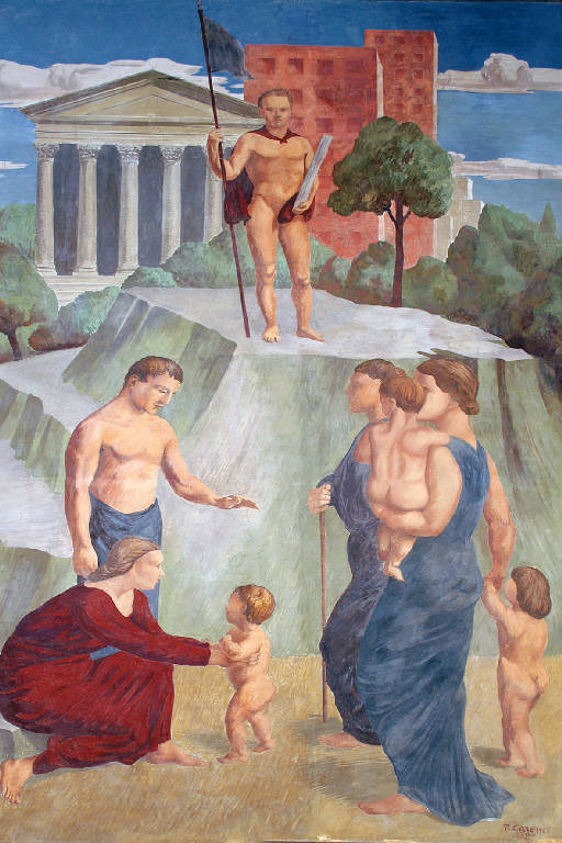 - NOTIZIE STORICO CRITICHE L'affresco raffigura la ricostruzione civile della Nazione, di cui la famiglia è il nucleo fondamentale in quanto ne garantisce la continuità, sotto il segno del fascio littorio, simbolo del Regime capace di riedificare sulle ceneri dell'impero antico quello moderno. Il dipinto doveva essere completato entro il giorno 28 ottobre1938 per la ricorrenza della Marcia su Roma.\nNel 1945 l'affresco, con quello di A.Beolchini, fu coperto da pittura murale e nascosto da una gigantografia in bianco e nero di G.Chiolini, raffigurante "le torri di Piazza Leonardo da Vinci a Pavia".\nI saggi effettuati dalla Ditta IRAC nella primavera del 1992, hanno evidenziato la possibilità di recuperare i due affreschi.