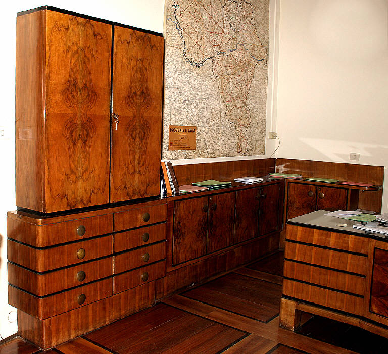 L'insieme costituisce l'arredo originario dell'ufficio ideato dall'architetto Morandotti. Consta: di una libreria a parete (formata da tre scomparti a due ante più bassi con un piano in cristallo nero e da un mobile più alto, con otto cassetti e due ante; maniglie in ottone); di una consolle (a due ante e due ripiani laterali sagomati, due per parte, piano in cristallo nero); di una scrivania (anteriormente presenta un riquadro in radica al centro e lateralmente, fasce orizzontali in legno chiaro, alternate da scanalature nere; nella parte posteriore, tre cassetti in alto e ai lati due antine; le maniglie sono in bachelite sagomata a fingere l'avorio); da un tavolo con gambe lisce, piano in cristallo nero e cassetto con pomolo; da un tavolino basso con gambe lisce, ripiano intermedio e top in cristallo nero. In tutti questi mobili, alcune spacchiature lisce presentano pannelli in legno con venature più scure con effetto decorativo.