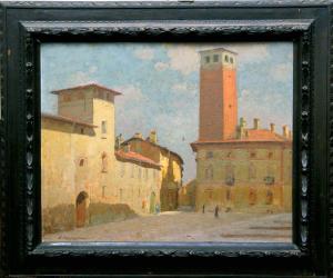 Veduta di Piazza Borromeo a Pavia, con l'istituto Santa Margherita a sinistra e palazzo con torre nello sfondo