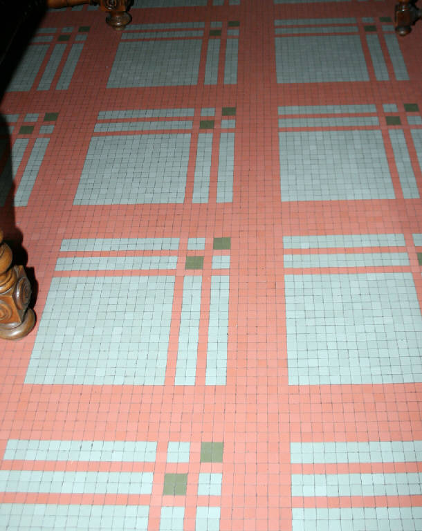 Pavimento a mosaico con tessere in ceramica: composizione geometrica fatta di riquadri regolari, con tessere rosa salmone che si intersecano perpendicolarmente su un fondo grigio/verde chiaro, intervallati da quadratini verdi oliva.