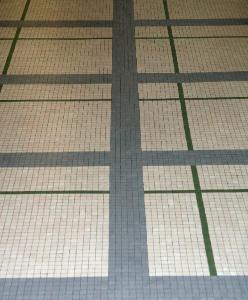 Pavimento a mosaico con tessere in ceramica grigia, bianca e verde: composizione geometrica fatta di linee verticali e orizzontali che si intersecano perpendicolarmente su un fondo chiaro. Lo stesso pavimento compare sia nell'atrio del primo piano che in quello del secondo.