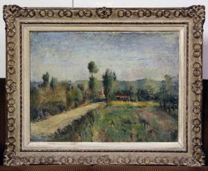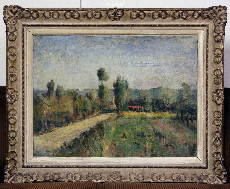 Paesaggio di campagna con strada sterrata sulla sinistra e sullo sfondo rustici e una chiesetta.\nLa tela è caratterizzata da una cornice lignea dipinta.