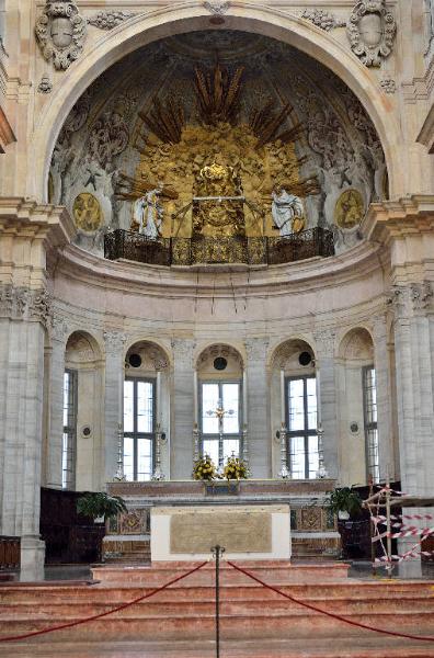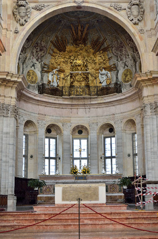 Il catino absidale risulta completamente rivestito da un esuberante partito decorativo in stucco simulante una grotta raggiata con nubi dorate al centro della quale due angeli sorreggono una grande corona di spine; tutt'intorno cherubini e angeli svolazzanti, ai lati le due figure simboliche a tuttotondo della Religione e della Patria; corredato da motivi fitomorfi e clipei con gli Evangelisti ad affresco. Il catino è percorso da un'elegante ringhiera in ferro battuto di protezione. Una volta all'anno in occasione della solennità di Pentecoste, la complessa scenografia barocca è completata da una coreografica macchina lignea removibile, chiamata 'Nuvola' o col termine dialettale 'Nivola', azionata da un argano che cala e innalza il prezioso reliquiario argenteo con le Sacre Spine della corona di Gesù, custodito in questa parte alta del sacello, per esporlo sull'altar maggiore alla venerazione dei fedeli. E' costituita da una base con nubi argentate e testine di cherubini dorate, sulla quale poggiano quattro angioletti ceroferari e al centro due slanciati angeli dalle grandi ali che trattengono un drappo scolpito destinato a sorreggere il reliquiario con le S. Spine. La nuvola è sormontata da un semicerchio in ferro sul quale si innestano sei testine di cherubini in legno dorato.