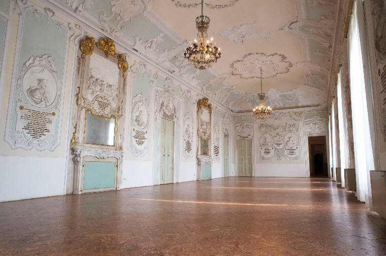 - NOTIZIE STORICO CRITICHE I fastosi ambienti di rappresentanza nell'ala nobile del castello di Belgioioso sono tra i più significativi complessi dell'architettura lombarda del XVIII secolo. In particolare nella Galleria degli Avi o degli Stucchi viene raggiunto un notevole livello qualitativo nella felice orchestrazione unitaria e nell'alta levatura dei singoli rilievi.\nIl partito decorativo a stucco, viene commissionato verosimilmente dal conte Antonio Barbiano di Belgioioso (1693-1779), del nobile casato ricordato da Dante nel canto XIV del Purgatorio.\nIl conte, nominato nel 1769 principe del Sacro Romano Impero e di Belgioioso (titolo trasmissibile ai maschi primogeniti con vari privilegi, fra cui quello di battere la cosiddetta "moneta di ostentazione" con la sua effigie), promuove nel secondo quarto del XVIII secolo una vasta e sontuosa trasformazione, in villa di delizia affacciata su un parco, del corpo di fabbrica del trecentesco "Castrum Zoiosum" che prevede anche l'abbellimento interno delle sale ad opera di alcuni tra i più rinomati artisti lombardi e non del tempo (Giovanni Ruggeri, Francesco Croce, Carlo Maria Giudici, Giovanni Battista Sassi, Carlo Beretta). La morte di Antonio nel 1779, causa l'interruzione dei lavori al castello, in seguito ripresi e portati a termine dal figlio Alberico XII .\nFondamentale per capire la portata dell'intervento in questa ala della villa di delizia è il testo pubblicato a Cremona nel 1810 del padre barnabita Cosimo Galeazzo Scotti (1759-1821) "Le giornate del Bembo colle veglie di Belgiojoso". L'opera è costituita da una serie di novelle che i proprietari del castello di Brembate e i loro invitati, fra cui lo stesso Scotti, narrano a turno per intrattenere gli ospiti. Nella finzione letteraria l'autore viene invitato a raccontare di una sua precedente visita nel prestigioso castello di Belgioioso, nel cui racconto è inclusa anche una puntuale e affidabile descrizione degli ambienti. Più precisamente nel racconto Scotti affida la descrizione della villa di delizia al professore di pittura Paolo Mescoli e al pittore vogherese Paolo Borroni (che lavorò realmente per i Barbiano) che tramandano un'accurata presentazione della sala con i pannelli narrativi e le targhe con le didascalie. In queste novelle morali ambientate a Belgioioso vengono quindi fornite indicazioni preziose in merito ad alcuni artisti attivi al suo interno, menzionando lo scultore Carlo Beretta, quale autore dei ritratti in stucco degli antenati della famiglia Barbiano. Il programma iconografico della galleria è volto a magnificare e ad esaltare il casato dei Barbiano e le sue origini.\nScarse sono le notizie relative a Carlo Beretta, detto il Berettone, nato a cavallo tra Sei e Settecento, attivo dal 1714 nella Fabbrica del Duomo di Milano, quindi a Novara e al Sacro Monte di Orta, il quale fece il viaggio di studio a Roma tra il 1718-1720. Influenzato dalla cultura romana, è considerato uno dei più abili artisti lombardi del XVIII secolo, vicino al barocchetto pieno.\nIn particolare la Galleria degli Avi o degli Stucchi rappresenta per Beretta un unicum in quanto risulta la sola opera, con le sculture del parco, a soggetto profano, inoltre è l'unica committenza privata che riceve. Il complesso decorativo a stucco, che celebra le gesta della casata, viene giudicato raro perché si tratta di un ciclo scultoreo, infatti molto più frequentemente era utilizzato la tecnica pittorica. \nLe pareti risultano articolate da un ricco e leggero repertorio di forme a rilievo (volute, festoni, conchiglie, elementi fitomorfi) dalle linee morbide, coerenti con il gusto del barocchetto. \nLa decorazione in stucco colpisce per la ben riuscita orchestrazione unitaria e per l'alta levatura dei singoli rilievi. Il criterio che organizza il programma iconografico è la simmetria rispetto all'asse trasversale della stanza. Nei quattro episodi si riscontrano vari livelli di aggetto dello stucco, dagli elementi principali in primo piano fortemente a rilievo, quasi a tutto tondo, che digradano fino allo sfondo con un rilievo minimo. Le storie narrate prendono le mosse da nord, dall'episodio molto elaborato con morti e feriti, della battaglia vinta da Giovanni III, padre di Antonio, sui turchi; sulla parete nord Carlo di Belgioioso ambasciatore di Ludovico il Moro, in ginocchio dinnanzi al re di Francia e la pace di S. Pietro, protagonista Bernardino III conte di Barbiano; sul lato sud il corteo successivo alla battaglia di Marino con il trionfo di Alberico Magno. I ritratti, le cornici ovali, i rilievi, i coronamenti delle finestre e delle sovrapporte in terracotta rivestiti di stucco bianco, risaltano sulle specchiature verde chiaro delle pareti e delle ante lignee che a loro volta spiccano sull'intonaco di fondo giallo chiaro delle pareti, ripreso nella volta. Un alto zoccolo bianco di lieve aggetto corre lungo il perimetro della galleria, raccordandosi alle modanature in stucco delle cornici di porte, finestre e camini.