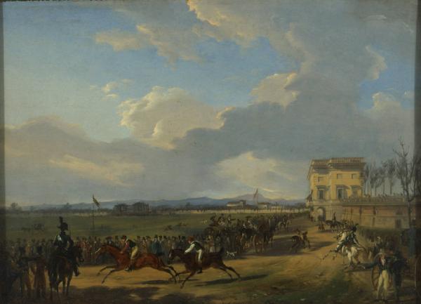 Corsa di cavalli in Piazza d'Armi. Lo spiazzo accanto all'arena di Milano con gara di corsa a cavallo